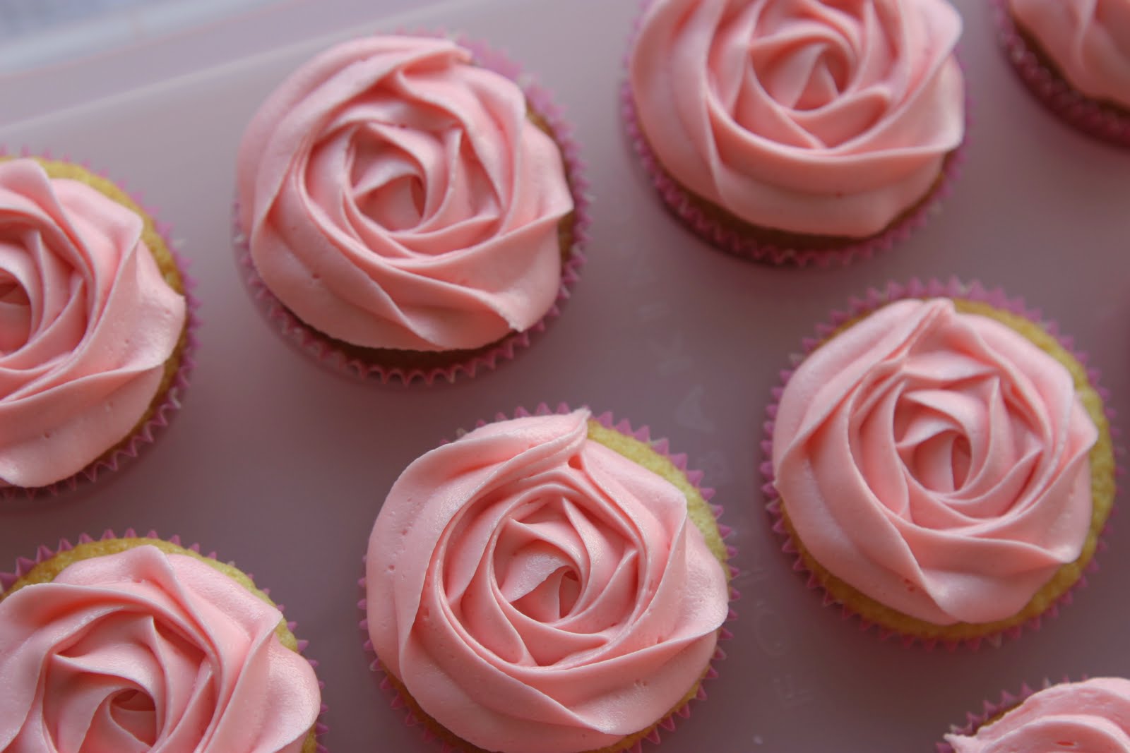 Use (for instance) a Wilton 2D tip to make these roses. Start the piping from the very middle, then continue making sircles outwards until you reach the edge of the paper case. It's so much easier than it looks, just give it a go!